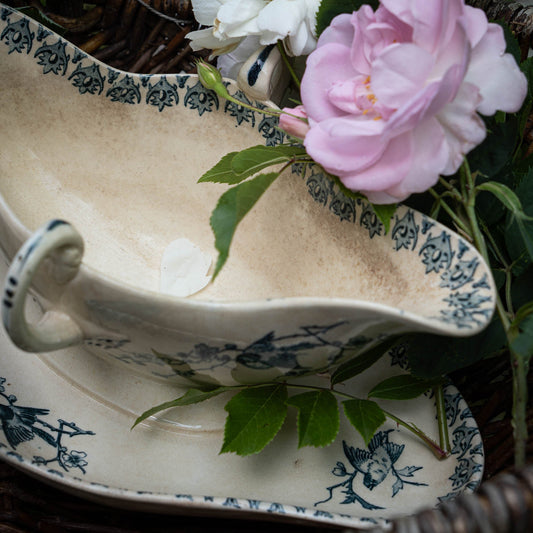 Antique Blue Gravy Boat with Sparrows - H.B. & Cie, Choisy-Le-Roy - 1900s