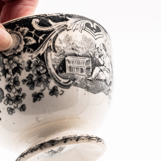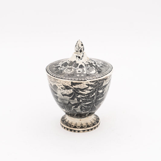 Black Transferware Lidded Sucrier (Sugar) on Pedestal - Alpine Scene - Sarreguemines - c. mid-19th Century