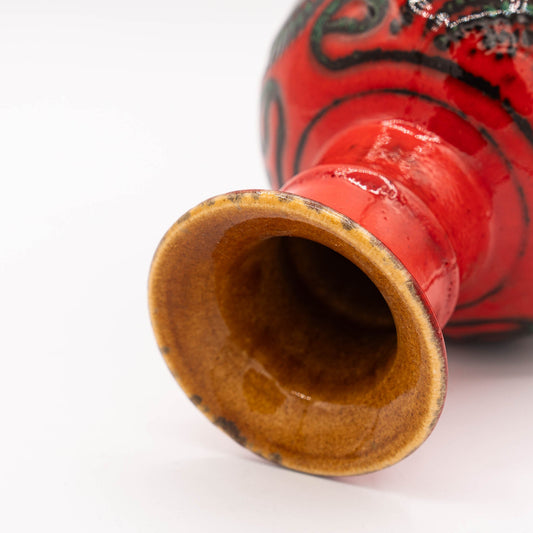 Vintage Red Vase with Floral Green Pattern - Bay Keramik - 68-20 - 1960s